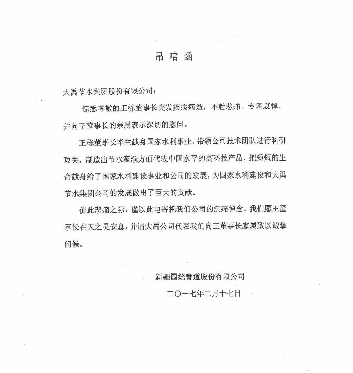 新疆国统管道股份有限公司纪念函