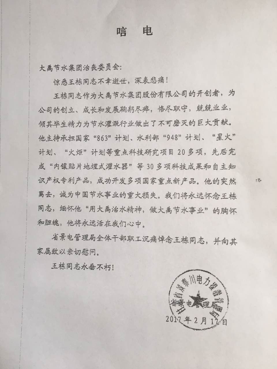 甘肃省景泰川电力提灌管理局唁电
