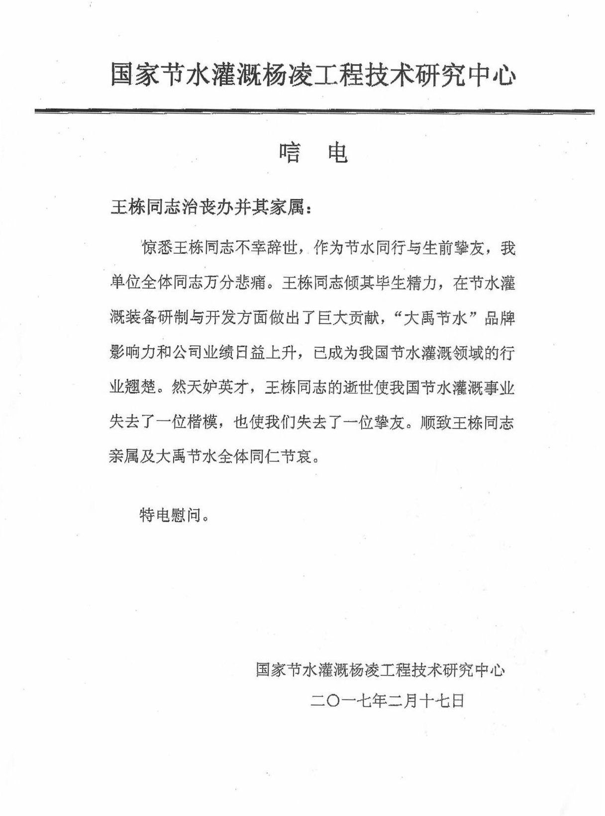 国家节水浇灌杨凌工程手艺研究中心唁电
