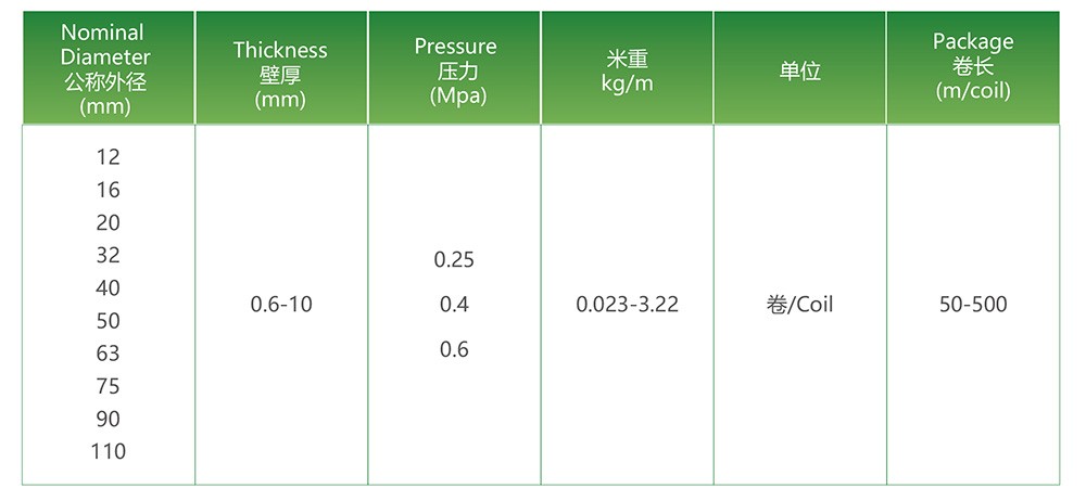 适用规模:中高压浇灌用管材用干管灌,微喷灌等主管道的地下部分:低压浇灌用管材用干管灌。喷灌。滴灌系统分支管道部分。