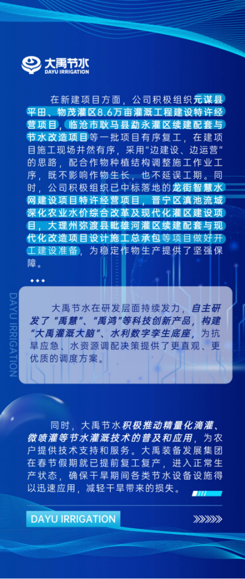 面临旱情,6t体育起劲响应党和国家的招呼,依附先进的节水手艺和扎实的项目建设基础,有力支援了云南抗旱应急事情,基本包管了农业生产、城乡供水不受旱情的影响。