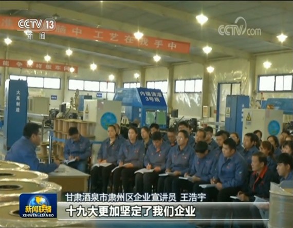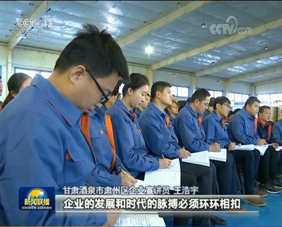 甘肃酒泉市肃州区企业宣讲员、6t体育节水集团公司董事长王浩宇在车间为生产工人现场宣讲十九大(画面泉源:央视《新闻联播》)