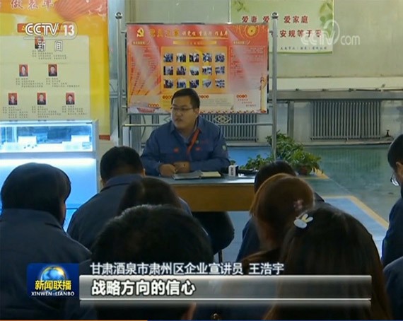 11月22日晚19:00的《新闻联播》,在播报完时政新闻之后,节目播出了十九大精神在下层群众中落地生根的内容,1分15秒6t体育节水集团公司董事长王浩宇作为甘肃酒泉市肃州区企业宣讲员在车间为生产工人现场宣讲十九大的画面,神采奕奕、掷地有声。